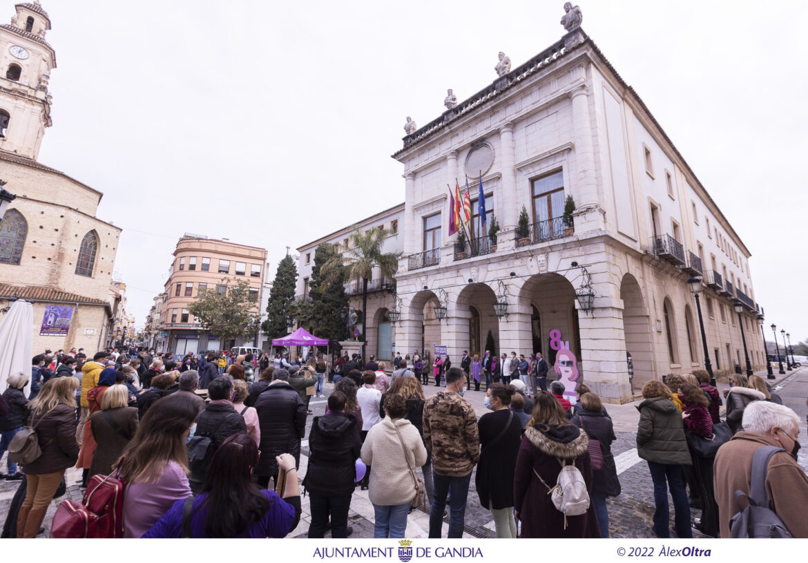 Una plaça Major de Gandia visiblement acolorida de violeta pel Dia Internacional de la Dona ha sigut testimoni del document que Rosa María Fernández, presidenta de l’Associació Rosa dels Vents, s’ha encarregat de donar a conéixer mitjançant la seua lectura.