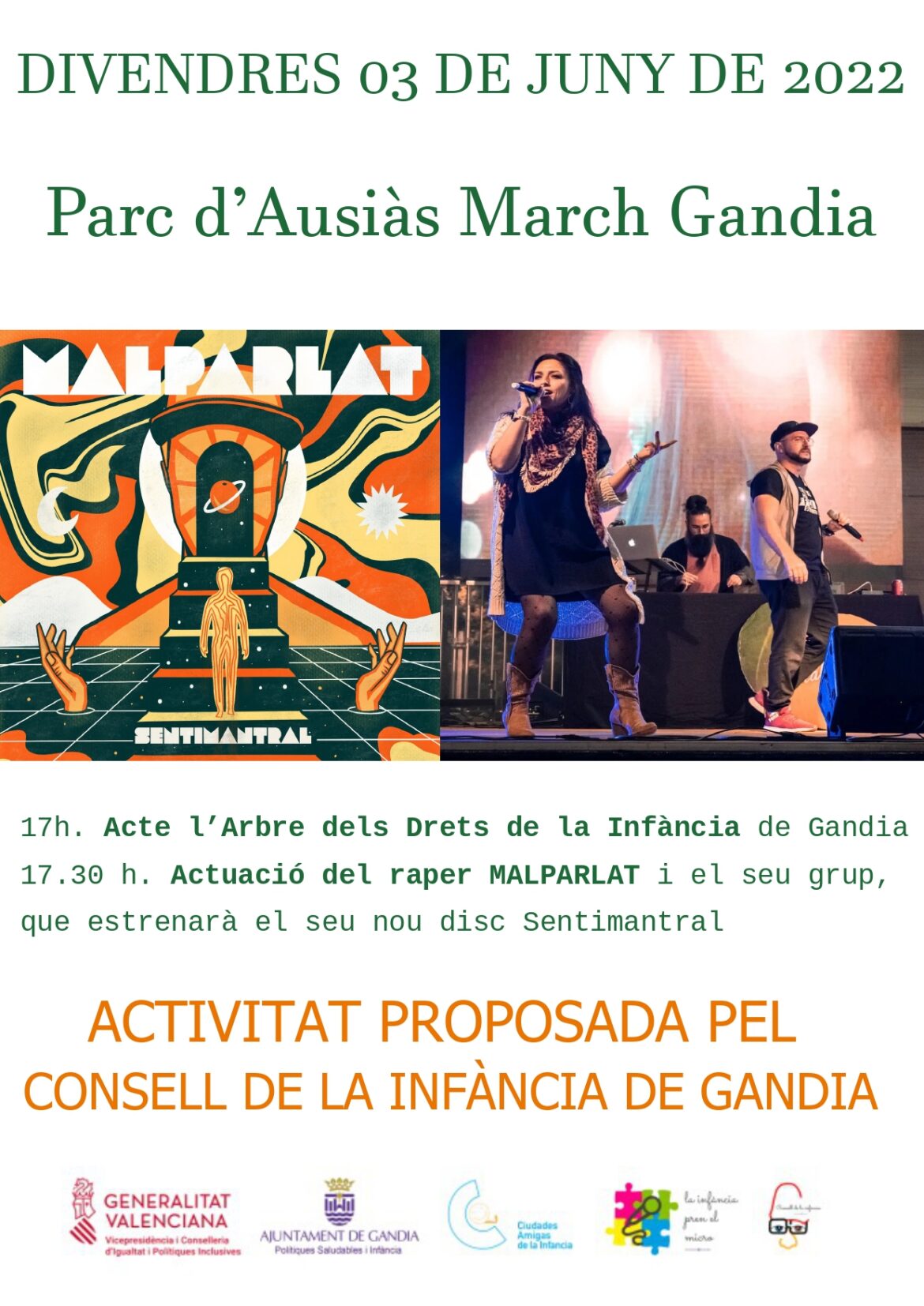 A les 17:00 h tindrà lloc l’Arbre dels Drets de la Infància, una iniciativa que compleix la seua quarta edició. Finalment, a les 17:30 h el raper Malparlat i el seu grup estrenaran el seu nou disc “Sentimantral”, compost per 17 cançons amb un estil entre el rap i la música tradicional.