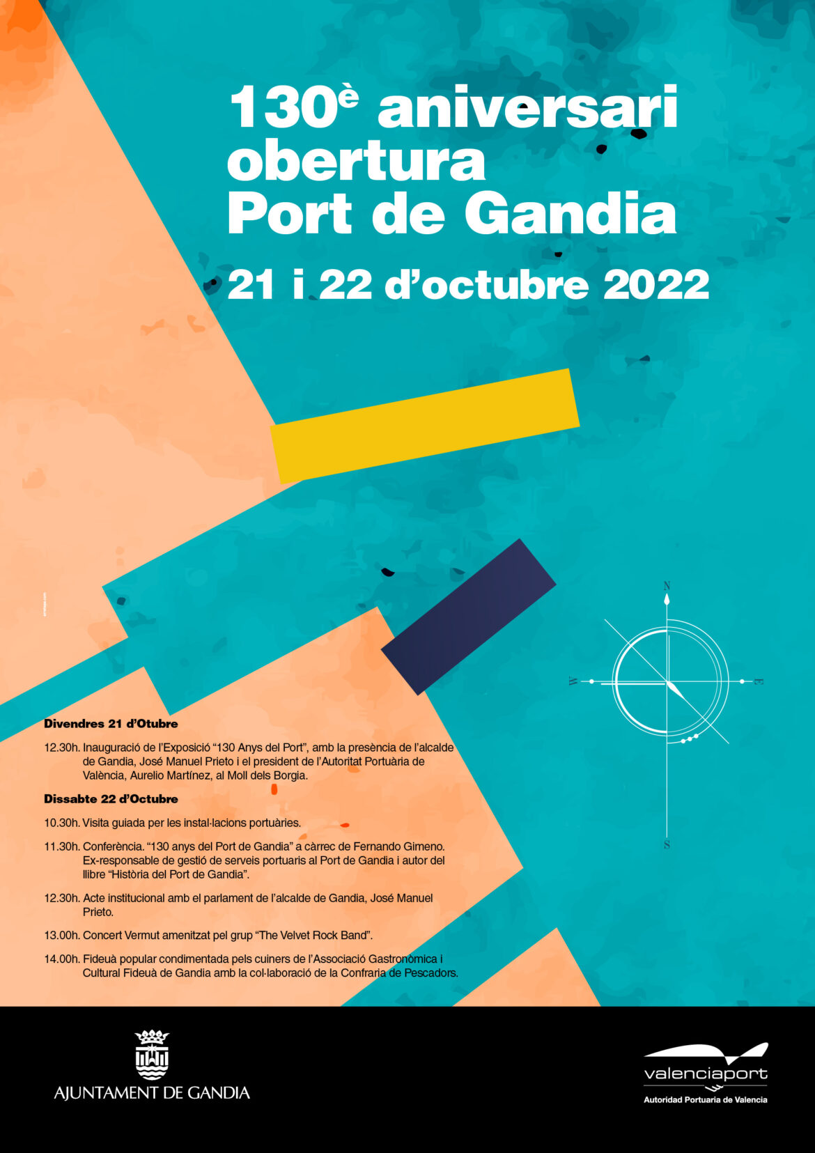 «Un 22 d’octubre de 1892 quan mitjançant una Reial Ordre es van autoritzar les operacions de càrrega i descarrega al port de Gandia», ha explicat Picornell. Així, coincidint amb aquest dia, el Moll dels Borja acull una variada programació commemorativa: Divendres 21, l’alcalde de la ciutat, José Manuel Prieto, i el president de l’Autoritat Portuària de València (APV), Aurelio Martínez, inauguraran una exposició fotogràfica, organitzada per APV, sobre aquest 130é aniversari.