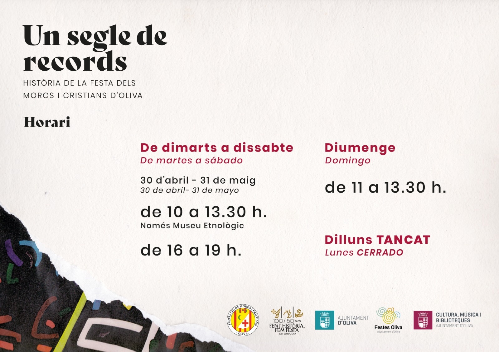 L’horari per visitar l’exposició «Un Segle de Records», del 30 d’abril fins el 31 de maig de 2021, és el següent: