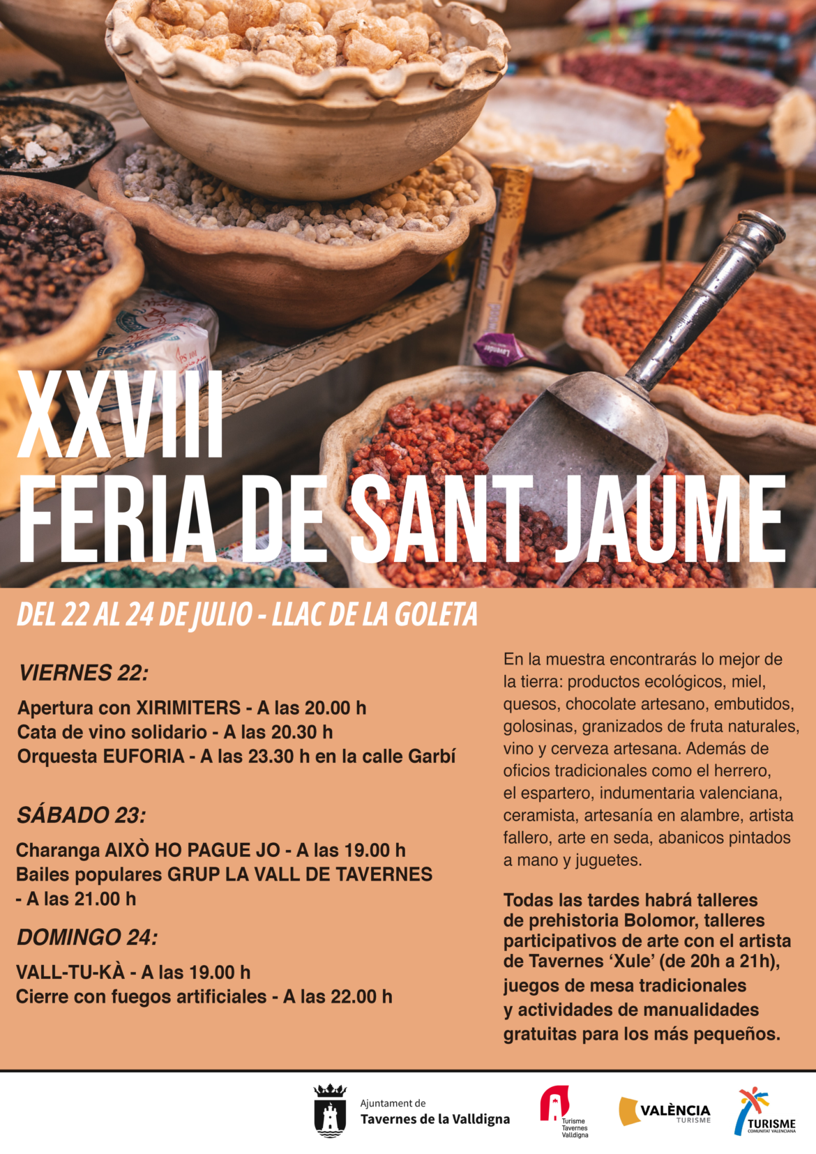 Tavernes de la Valldigna torna a celebrar en la platja una nova edició de la Fira de Sant Jaume, des del divendres 22 fins al diumenge 24 de juliol. De nou, la 28a edició es desenvoluparà en el parc del Llac de la Goleta amb una sèrie d’activitats que giraran al voltant de la gastronomia local, els productes valencians, la cultura i la música vallera, les tradicions, l’art i el patrimoni històric de Tavernes.