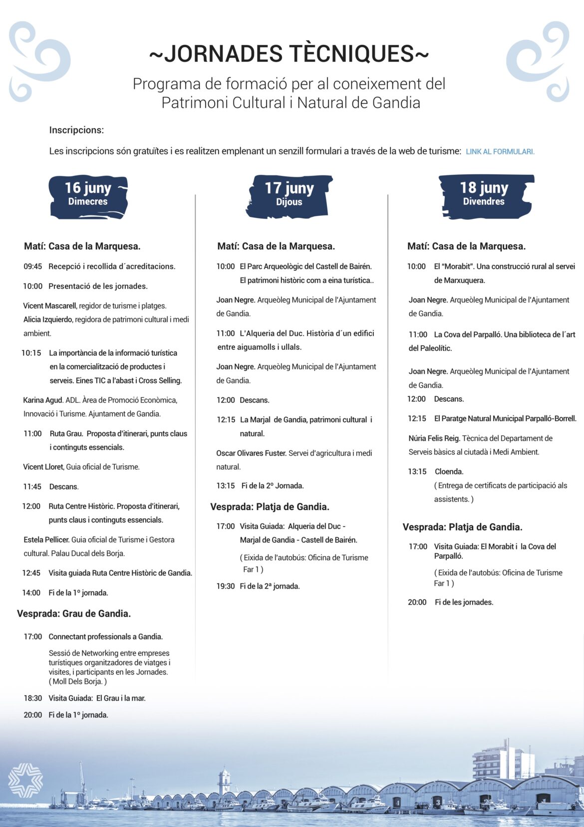 El Ayuntamiento de Gandía, en el marco del proyecto de Puesta en valor del patrimonio cultural y natural de la ciudad, organiza los días 16, 17 y 18 de junio las Y Jornadas Técnicas para el Conocimiento del Patrimonio Cultural y Natural. Se trata de una iniciativa promovida por los Departamentos de Turismo y Medio Ambiente dirigida a profesionales del sector turístico, guías de turismo, además de las empresas col • doras del SICTED Gandía.