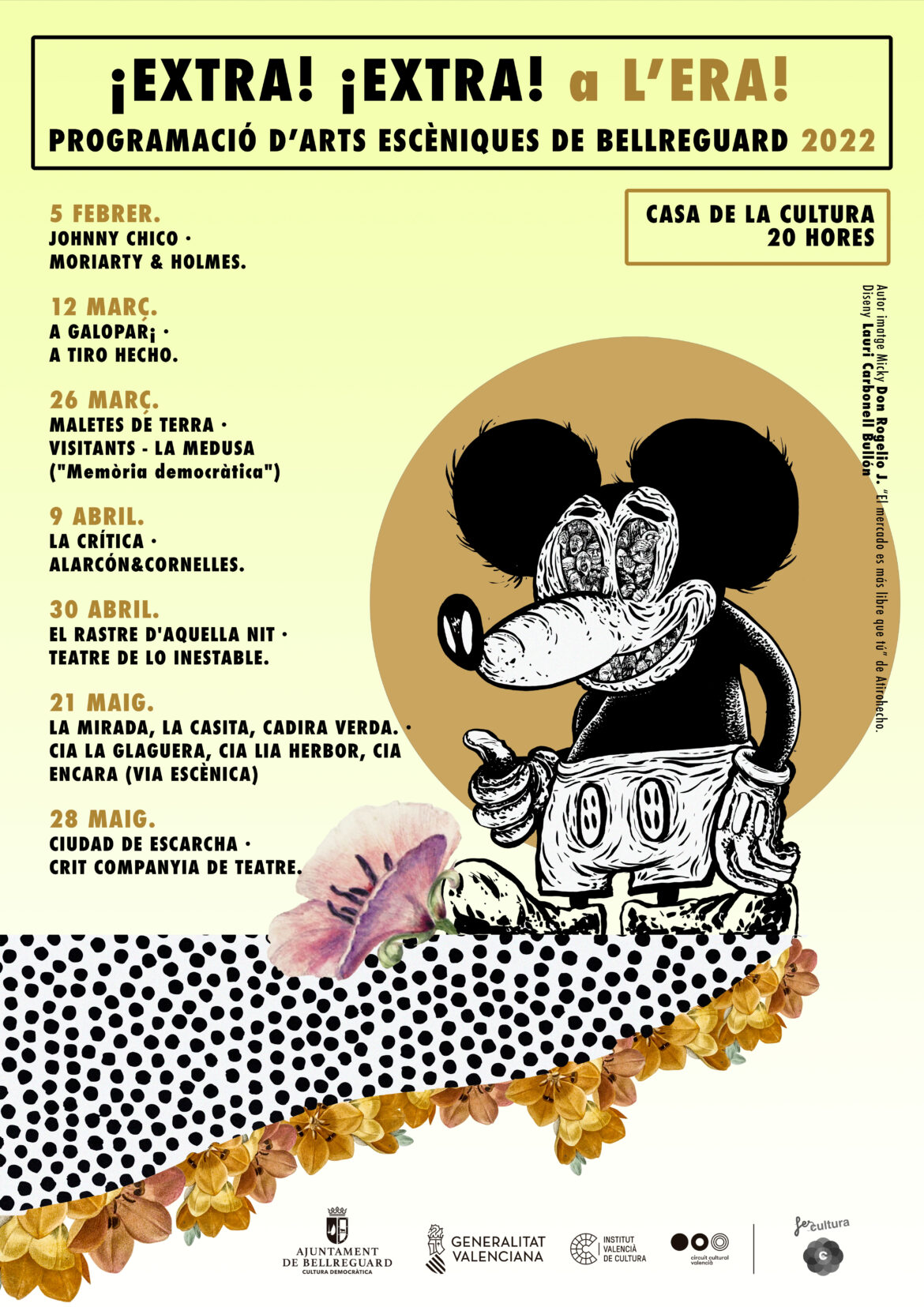 Arriba de nou ‘…A l’Era’, i és ja la tercera edició després de la magnífica acollida que van tindre les dos primeres, tot i les dificultats imposades per la pandèmia. La gran aposta del departament de Cultura de l’Ajuntament de Bellreguard per dotar al poble d’una programació escènica estable arranca el 5 de febrer i inclourà un total de 8 espectacles en la seua primera part, abans de la parada estiuenca, quan l’oferta escènica es trasllada temporalment a la platja amb el festival de circ Rodafam Arts.