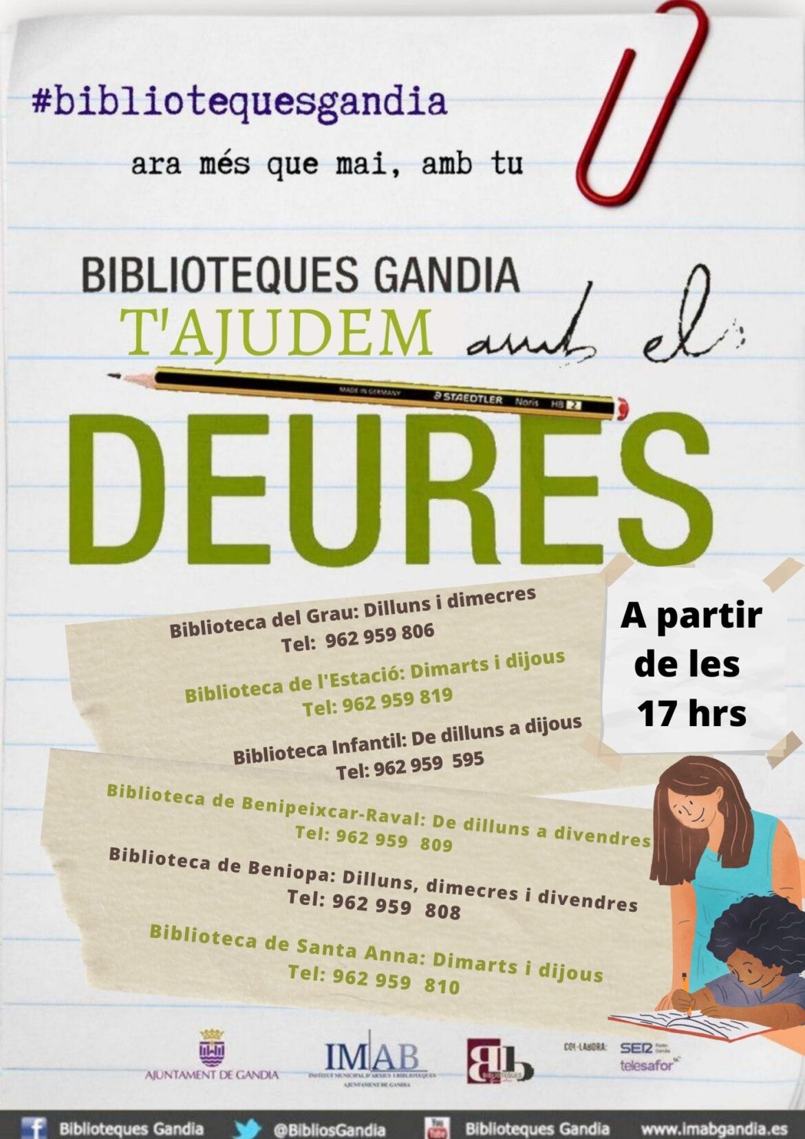 · Liduvina Gil: “Tots els xiquets i xiquetes podran accedir a un reforç escolar en cas que ho necessiten perquè creiem que una bona educació garanteix uns millors ciutadans en el futur”Gandia, 12 de gener 2022.-LLes Biblioteques de Gandia presenten el servei de Reforç educatiu, que es desenvoluparà a totes les biblioteques de la ciutat i també a la Biblioteca Infantil des d’aquesta mateixa setmana i fins al final del curs escolar.