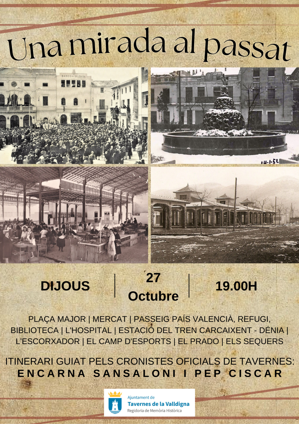 L’Ajuntament de Tavernes, a través de la Regidoria de Memòria Històrica, i amb el treball dels cronistes oficials, Encarna Sansaloni i Pep Ciscar, presentarà este dijous 27 el projecte fotogràfic de memòria històrica ‘Una mirada al passat’. Es tracta d’un itinerari pels punts més emblemàtics del municipi per a recordar la seua història a través de les fotografies recopilades per l’Ajuntament, el Centre Excursionista de Tavernes i també veïns i veïnes.