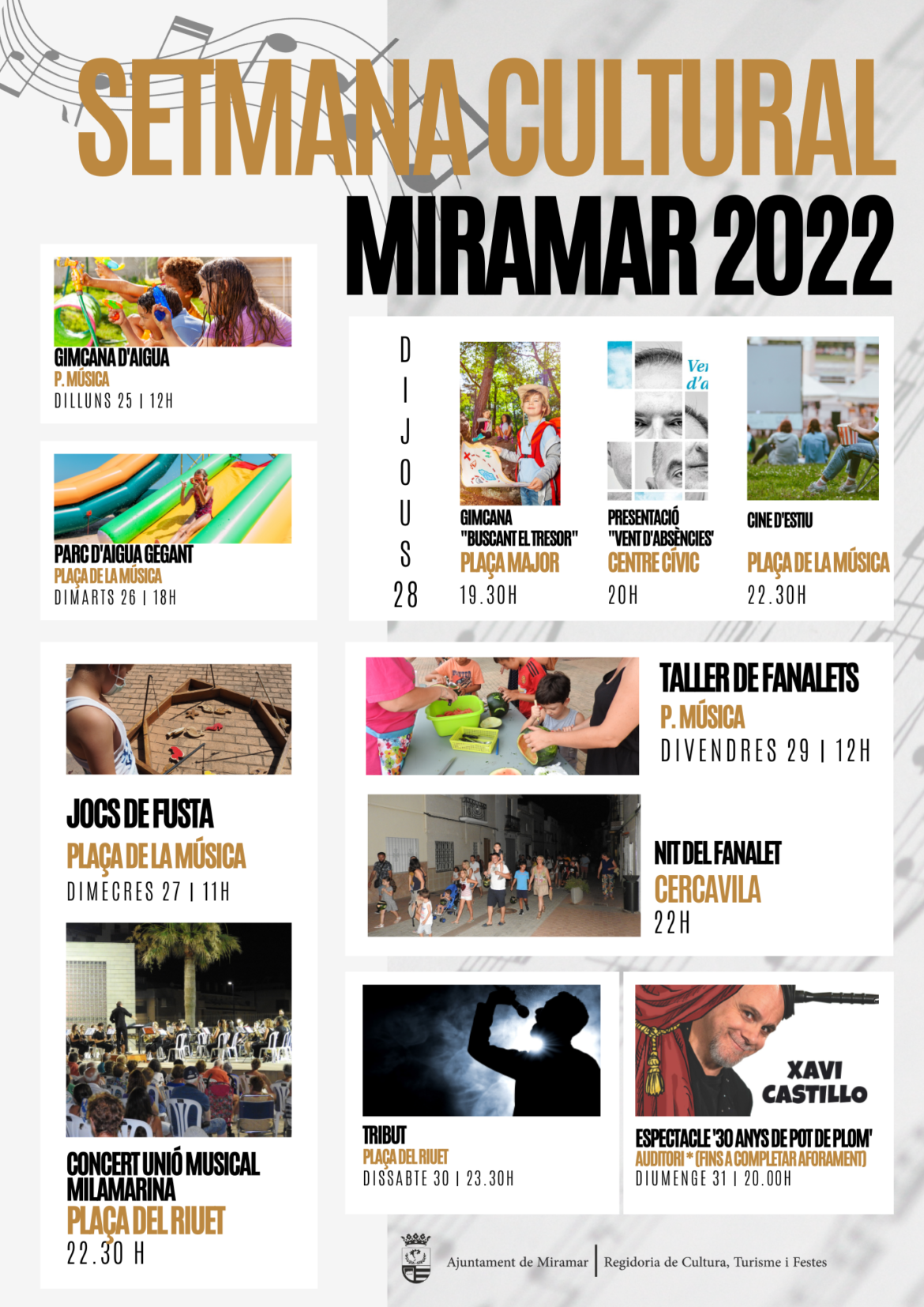 La regidoria de Cultura juntament amb les regidories de Turisme i Festes de l’Ajuntament de Miramar organitza del 25 al 31 de juliol la setmana cultural amb activitats per a totes les edats.